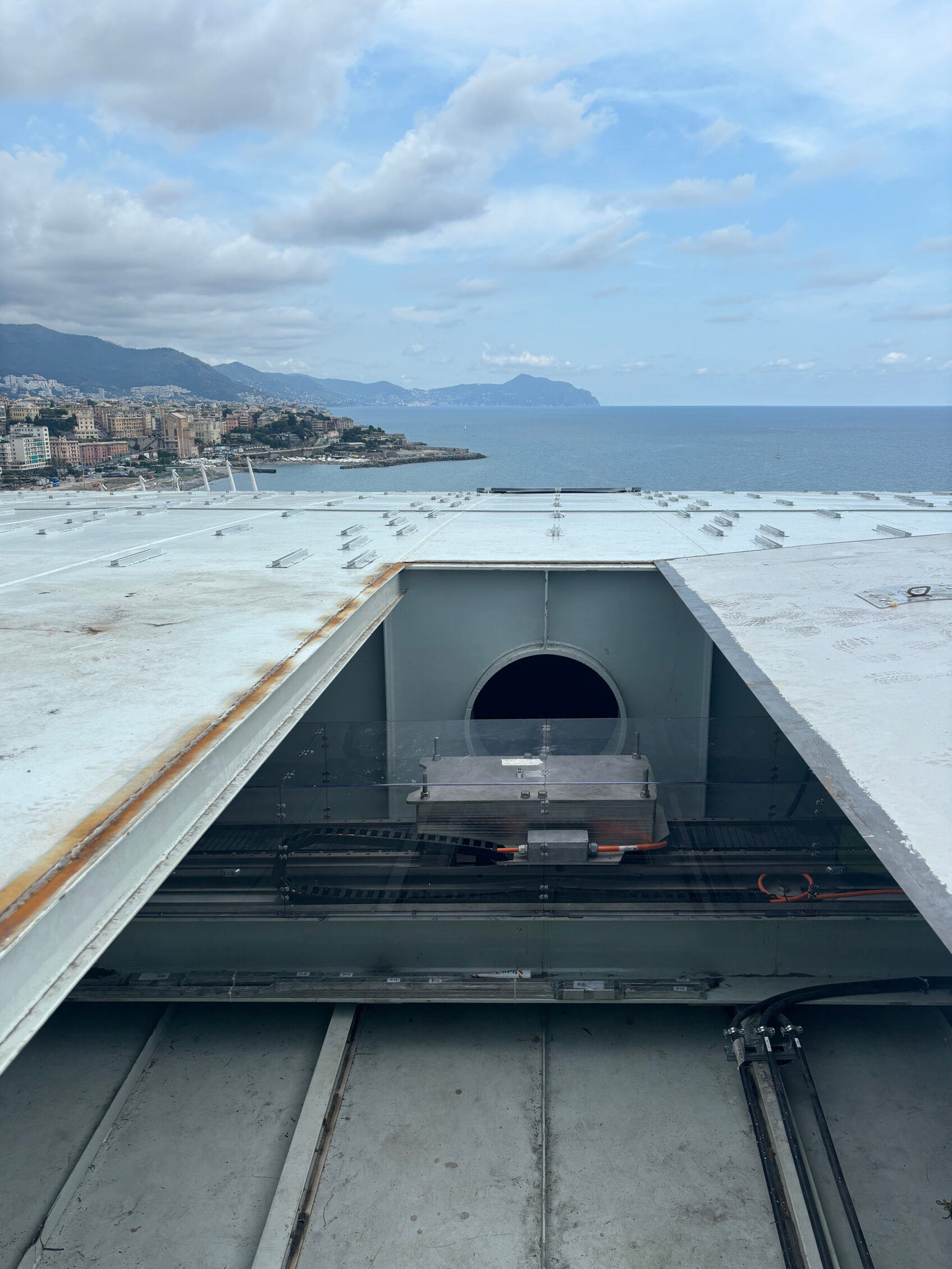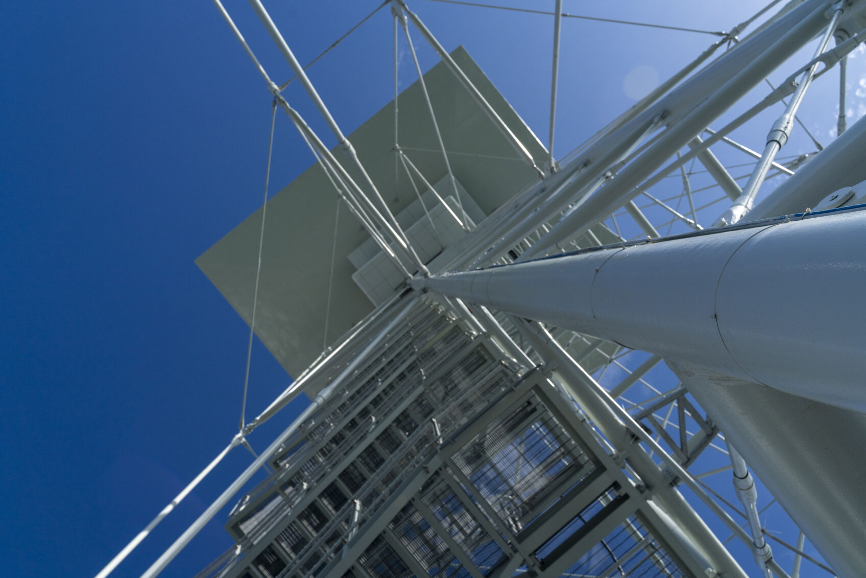 Il pavimento della cabina di controllo, completamente vetrata, è realizzato con travi in acciaio a sbalzo rastremate, che sostengono i pannelli in X-Lam posati nello spessore delle travi stesse. Controventature a pavimento garantiscono la formazione di una superficie rigida e indeformabile. La copertura è un quadrato di 30×30 metri, costituito da travi reticolari che si assottigliano verso il perimetro fino a diventare un unico profilo realizzato per saldatura di piastre. Sulla sommità sono installati i pannelli fotovoltaici che assolvono al fabbisogno energetico della struttura.
