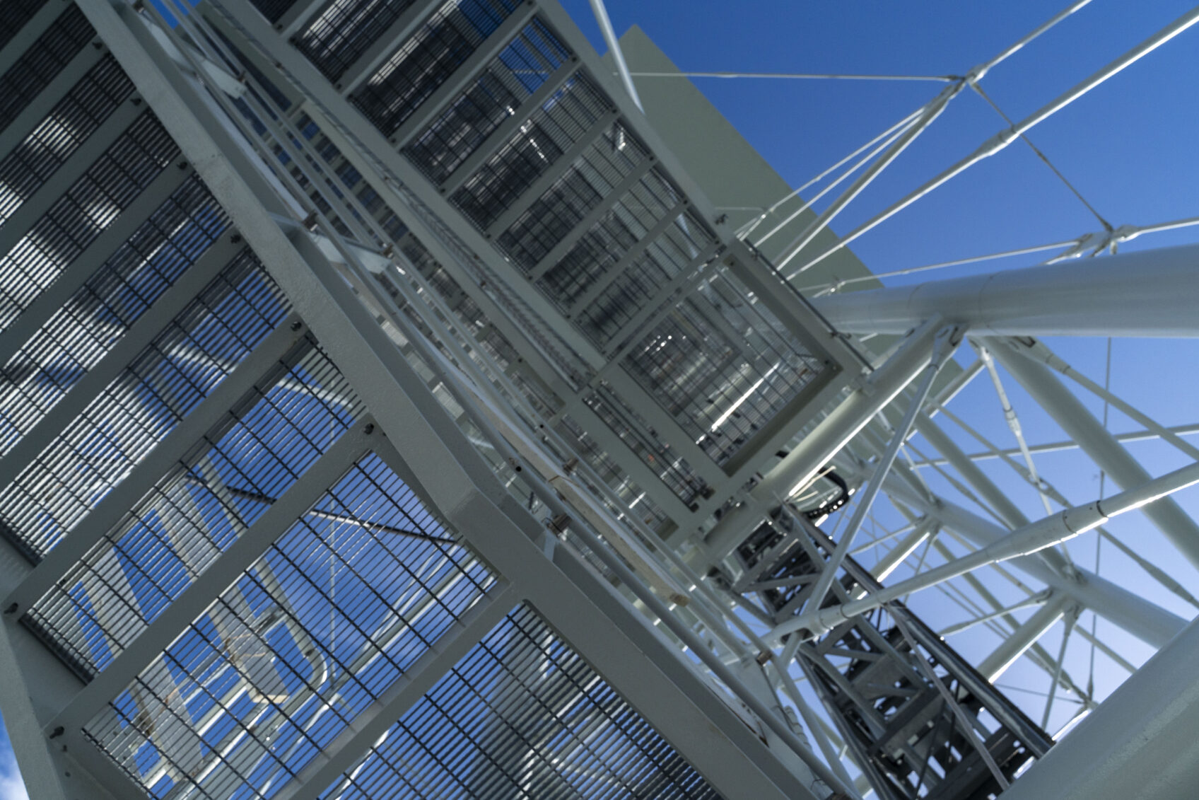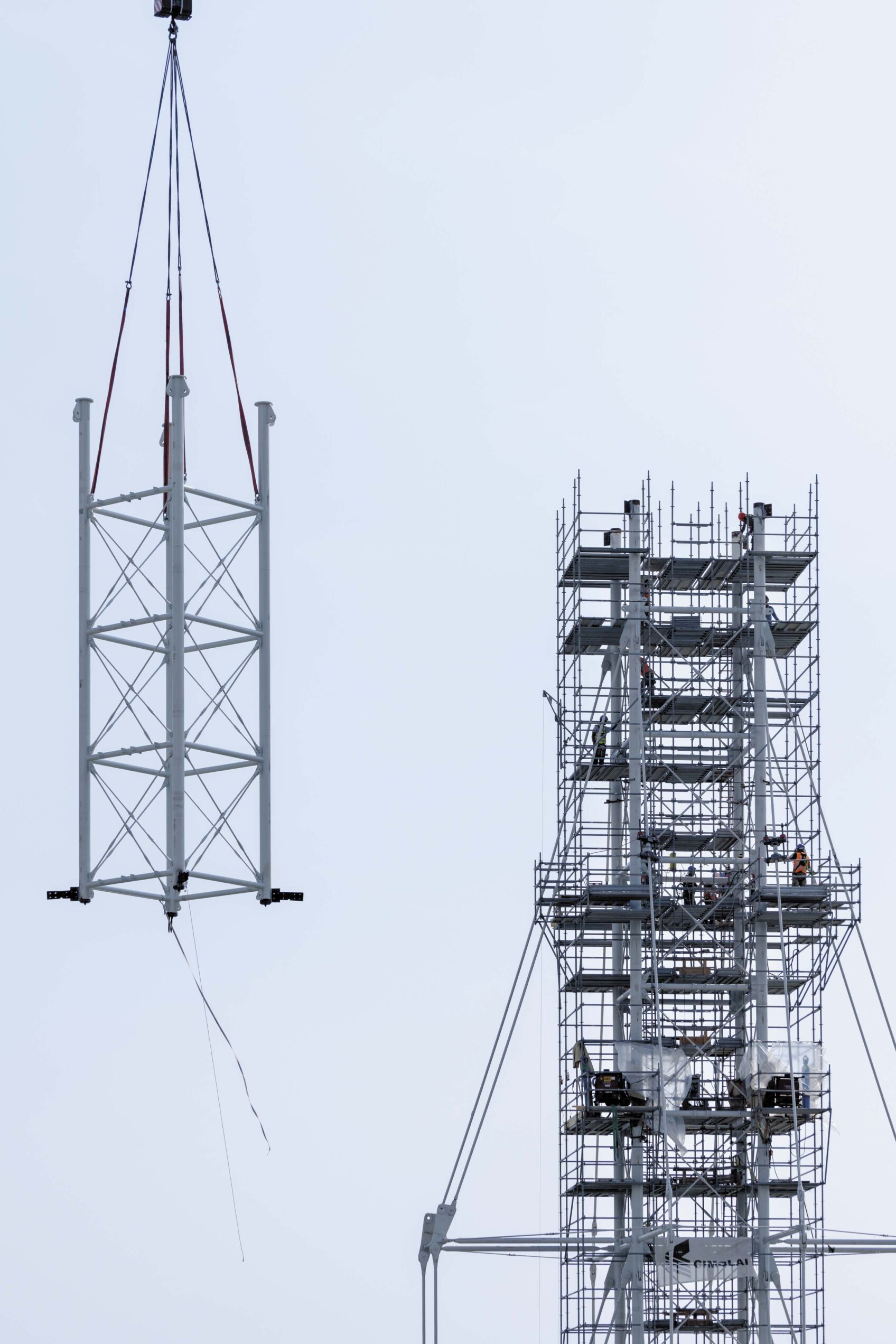 Una torre in acciaio alta 66 metri emerge da un edificio di servizio di due piani in calcestruzzo.