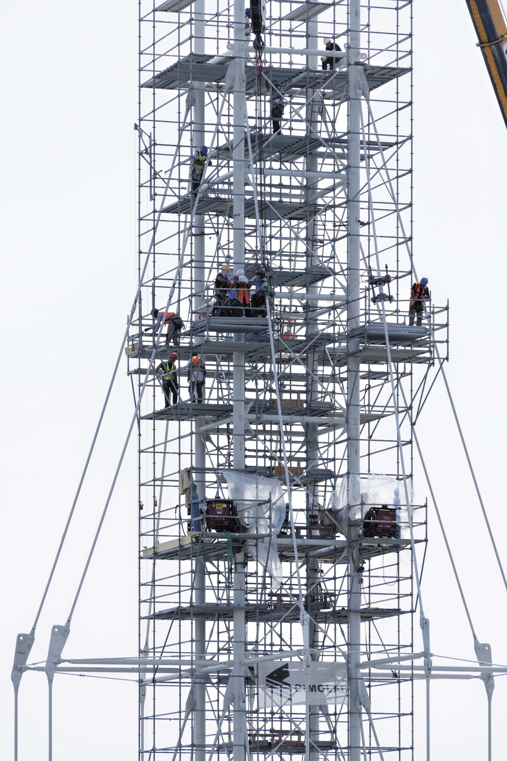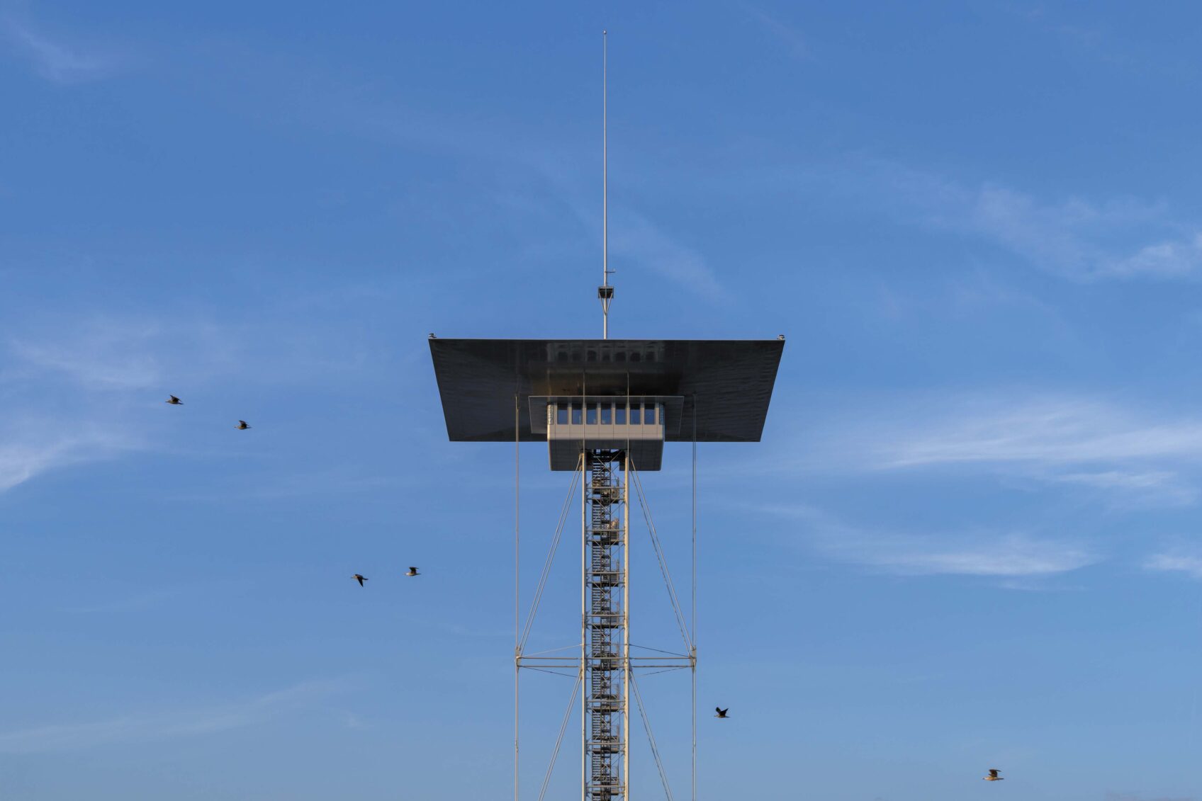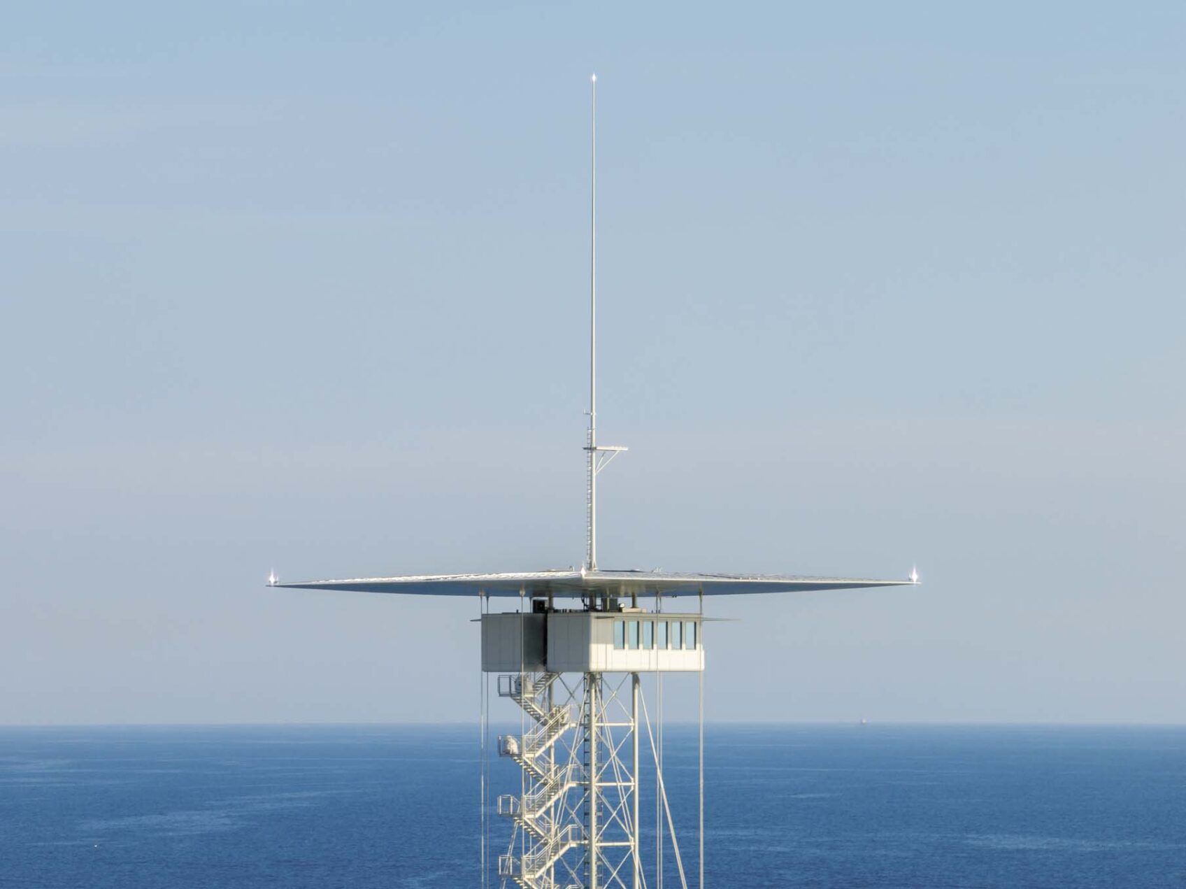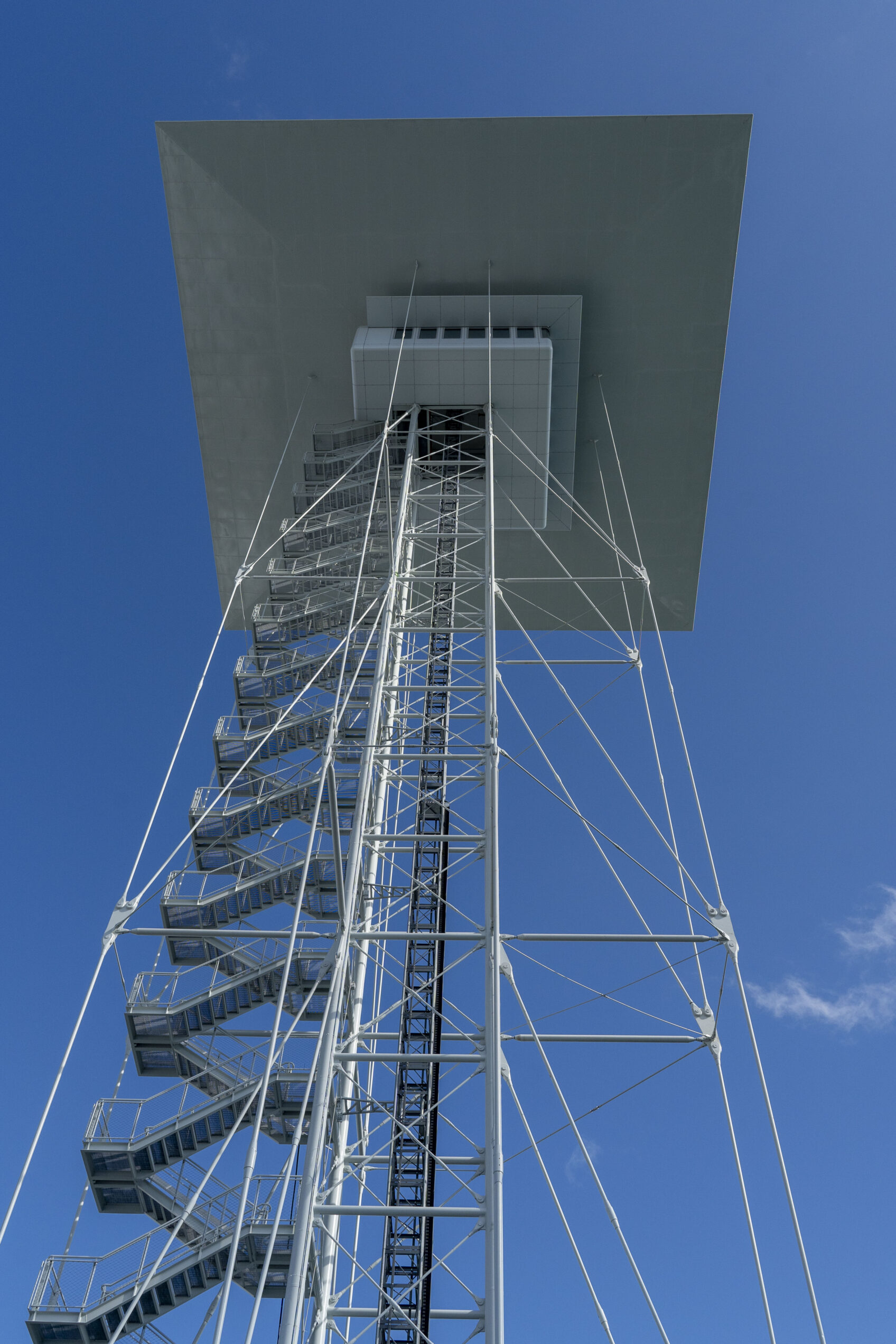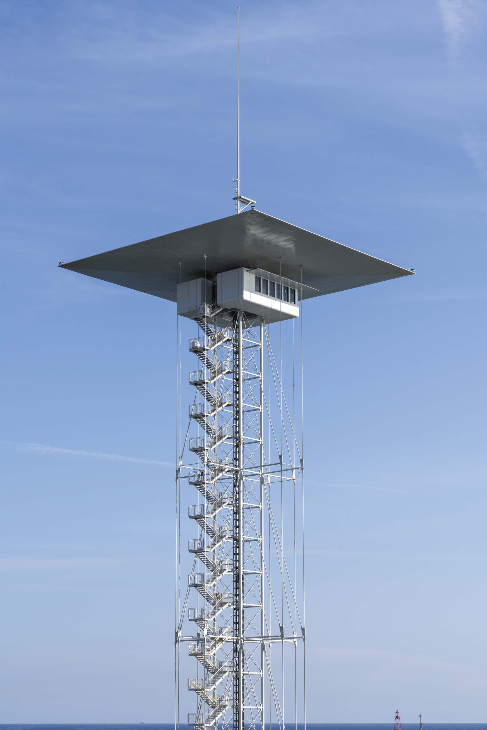 La cabina di controllo in cima è protetta da una grande copertura quadrata con lato di 30 m.